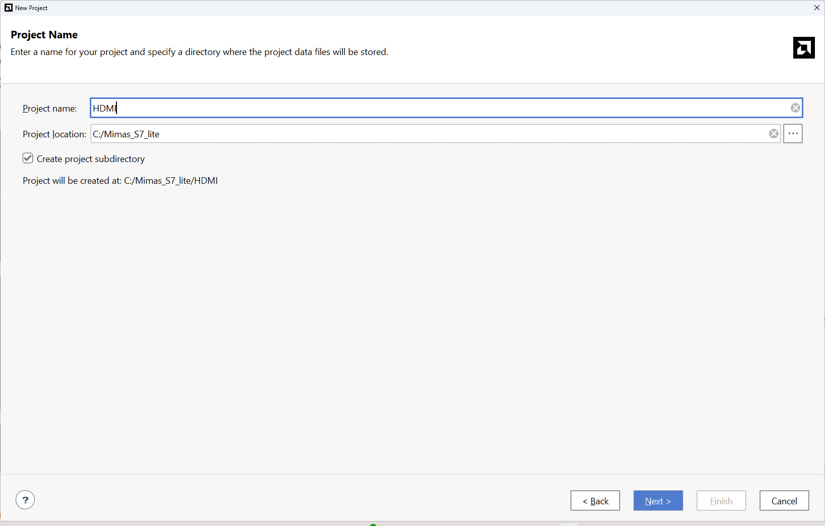 Type in a project name and save it at a convenient location. For this example “HDMI” is used as project name, but feel free to use any name. Select the check box below to keep all project files in a single folder. The image below shows the settings for the example project. Click “Next” to continue.