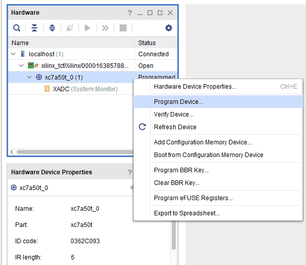Now, right click on the device “xc7a50t_0 (1)”and click “Program Device”.