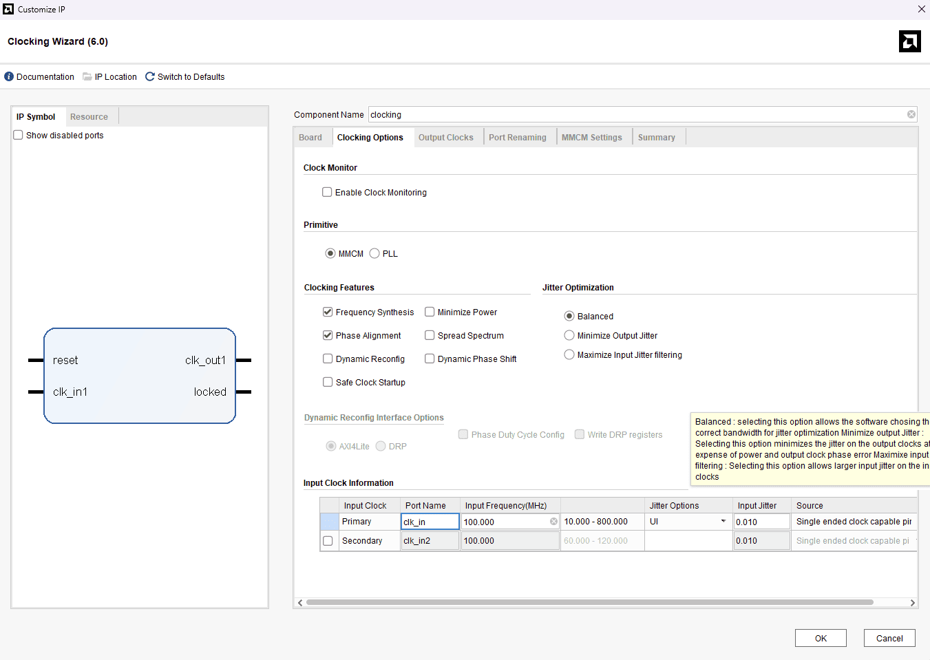 In “Clocking Options” tab, give Component Name as “clocking” and primary clock port name as “clk_in”.