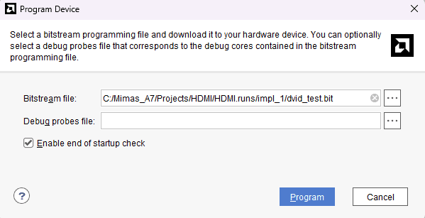 Select the mimas a7 HDMI out bitstream and click “Program”.