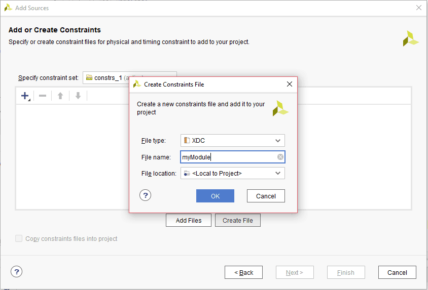 2. Click on “Create file” and give a name for the XDC and select “File type” as “XDC”. Click “OK” and then “Finish”.