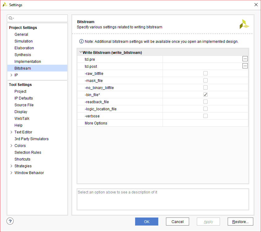 Right click on “Generate Bitstream” in the Flow Navigator panel. Select the “Bitstream Settings” and check the “-bin_file”. Click “Apply” and then “OK”.
