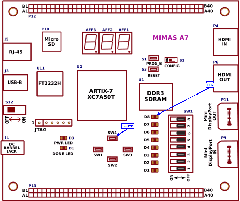 Let’s take a closer look at the Mimas A7 FPGA Development Board. The following image shows the LED and switch we are planning to use on Mimas A7.