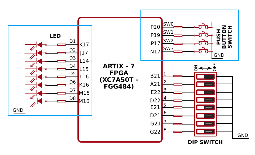 We will use the Mimas A7 FPGA Development Board to implement our module. Mimas A7 board has a Xilinx Artix 7 FPGA, a DDR SDRAM and a few other peripherals on board. The exact FPGA part number used on this board is XC7A50T-1FGG484C. The image below shows the part of the schematics where FPGA IOs for LEDs and Push Button Switches are connected. We will use one Push Button Switch and one LED to implement our logic.