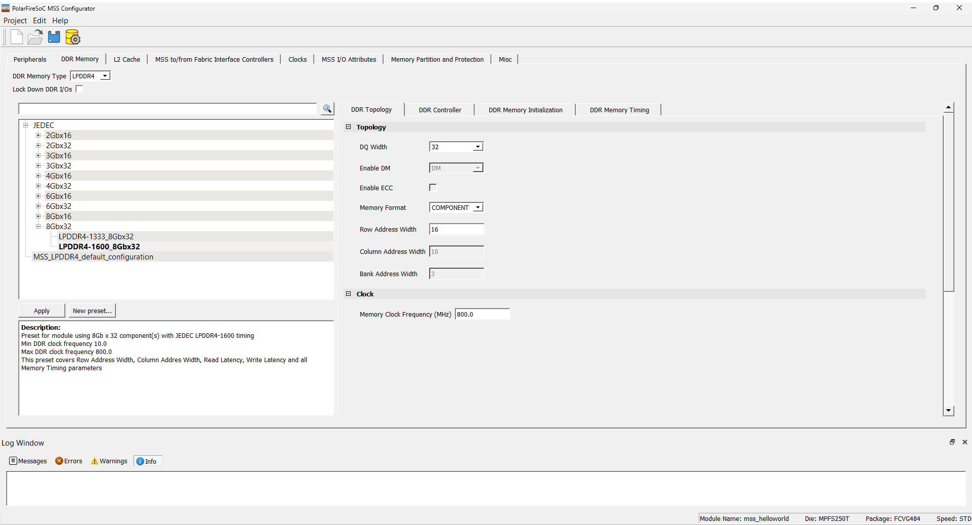 Now, under the “DDR Memory” tab, select “LPDDR4” as the “DDR Memory Type.” Choose “LPDDR4-1600_8Gbx32” as the JEDEC Configuration. Please maintain the default values for the “DDR Topology,” “DDR Controller,” “DDR Memory Initialization,” and “DDR Memory Timing” tabs.