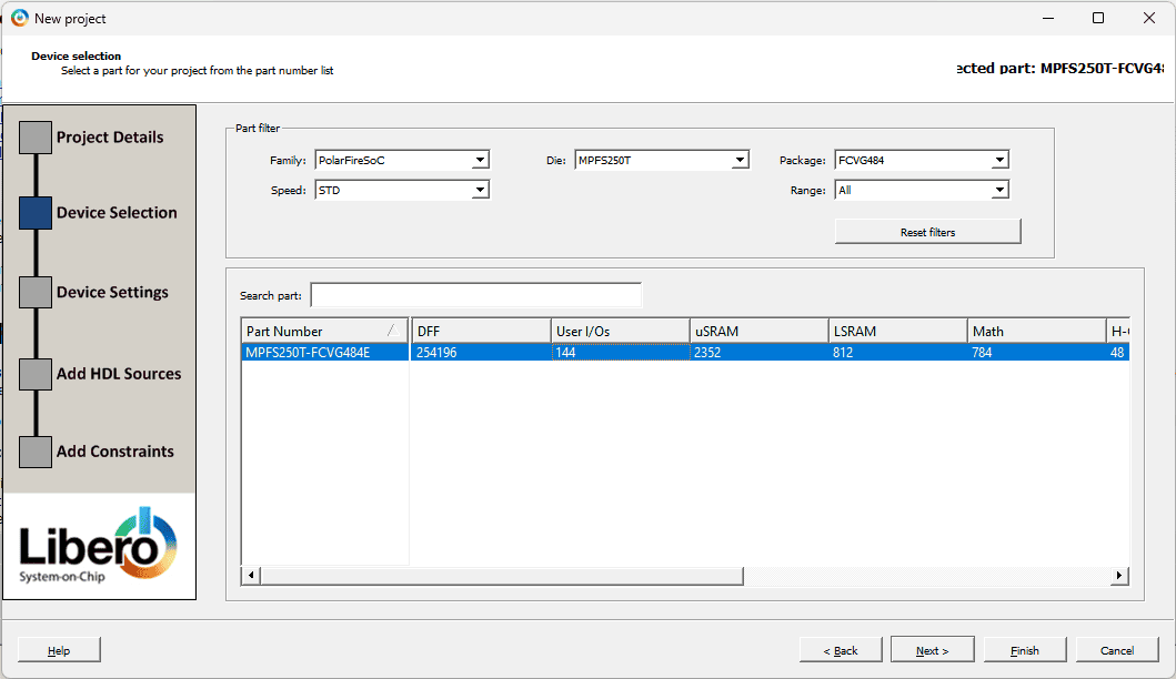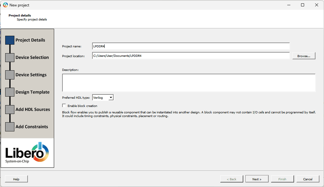 Open Libero SoC, then create a new project by clicking on “Project” > “New Project.” Given the Project name and Project location Click Next.