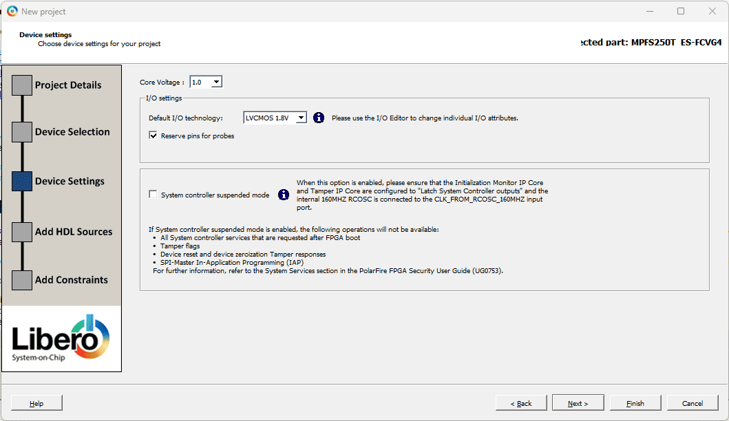 In the Device setting window select the Core Voltage as 1.0V and Default I/O Technology as LVCMOS 1.8V. Click Next.