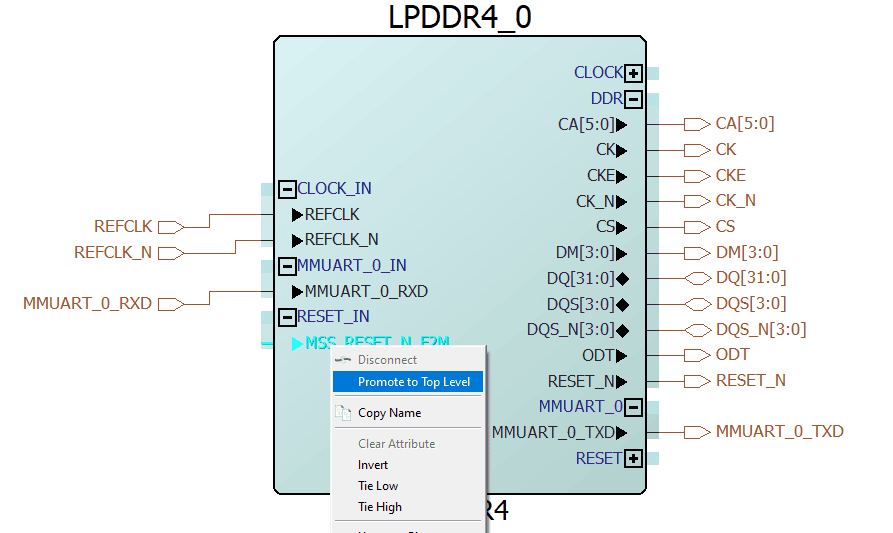 Upon opening the I/O Editor window, you’ll see the complete set of constraints, which includes LPDDR4 and UART pins. You should focus on setting the constraint solely for the MSS reset and connecting the MSS Reset pin to H7. After making these adjustments, save and close the I/O Editor window.s