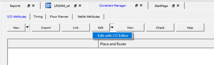 After the synthesis process is finished, double-click on “Manage Constraints” under the “Constraint” option. Then, select “Edit” under the I/O Attribute Tab within the constraint manager window, and choose “Edit with I/O Editor“.