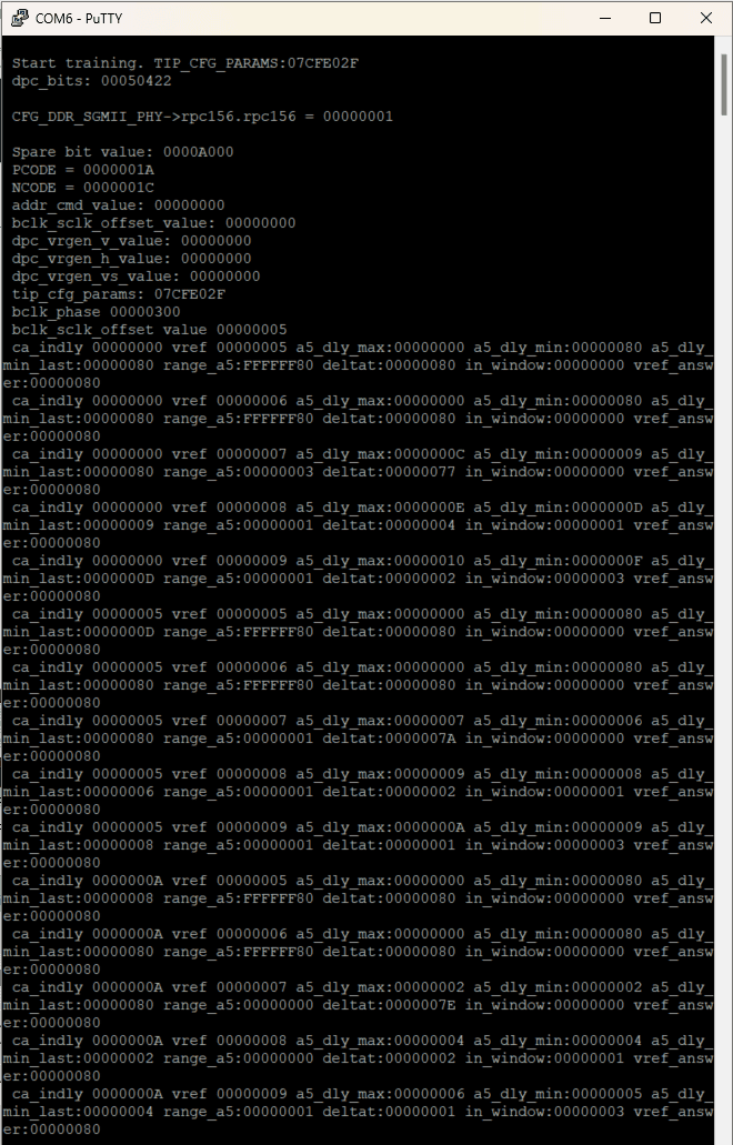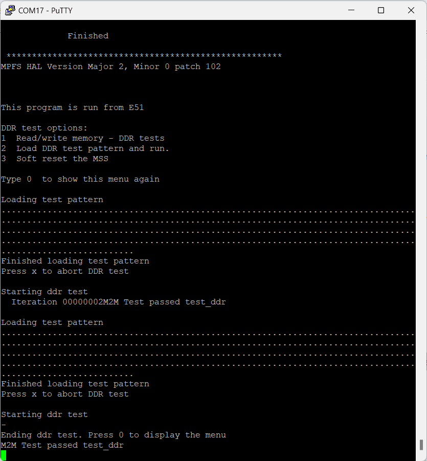 Once the programming is successful, launch the serial terminal and identify the correct COM port for MMUART0, which can be found in the device manager. You will observe the output printed on the serial terminal, such as Putty. A menu option will be printed to run necessary test.