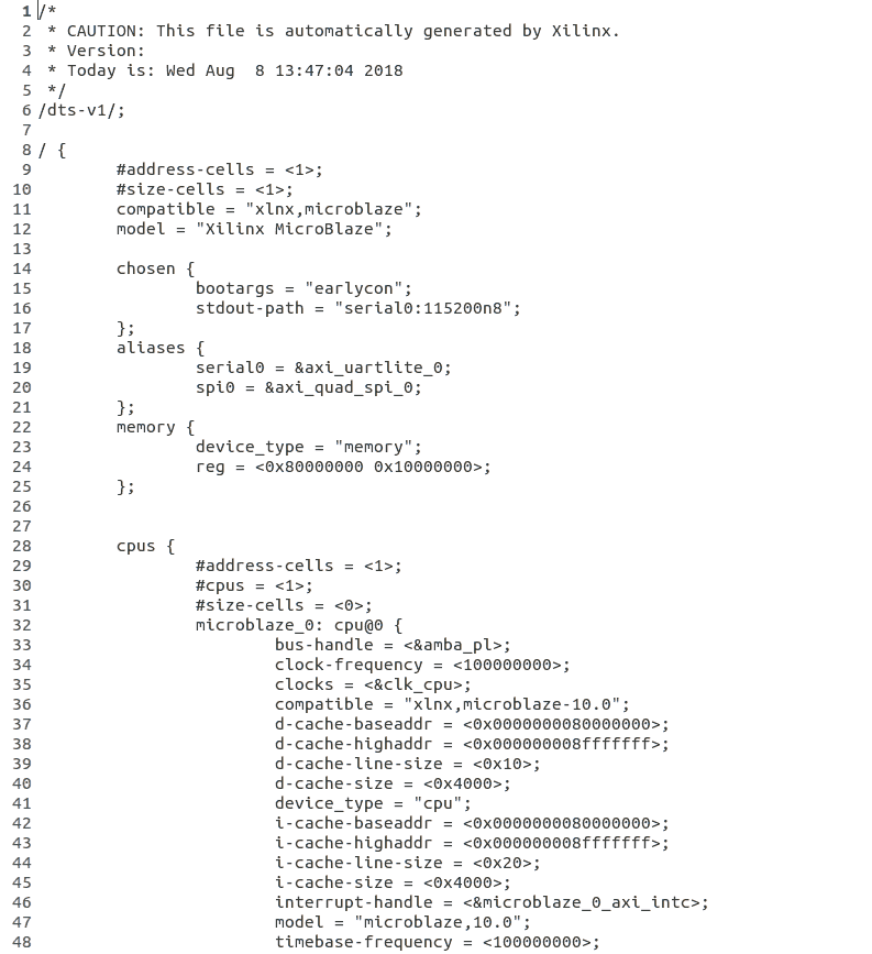 Step 5: We have to merge the ‘.dtsi’ and ‘.dts’ files. Merge these two files using text editor (like Notepad++ etc) and copy the contents of system-top.dts and paste them in the .dtsi file just after the line model = “Xilinx MicroBlaze”. Don’t forget to add “/dts-v1/;” at the top of .dtsi file also. The final content should look like this: