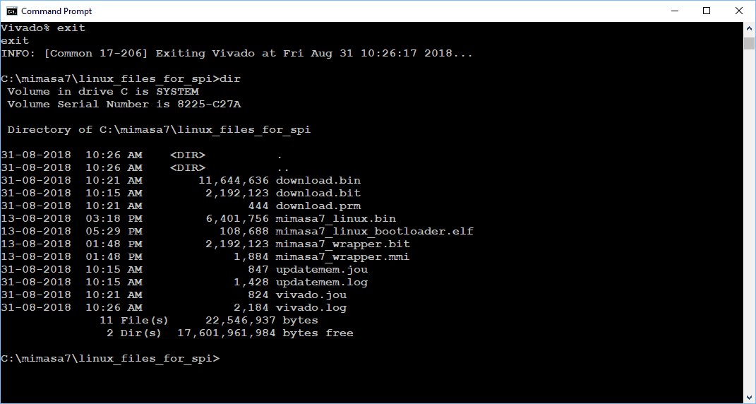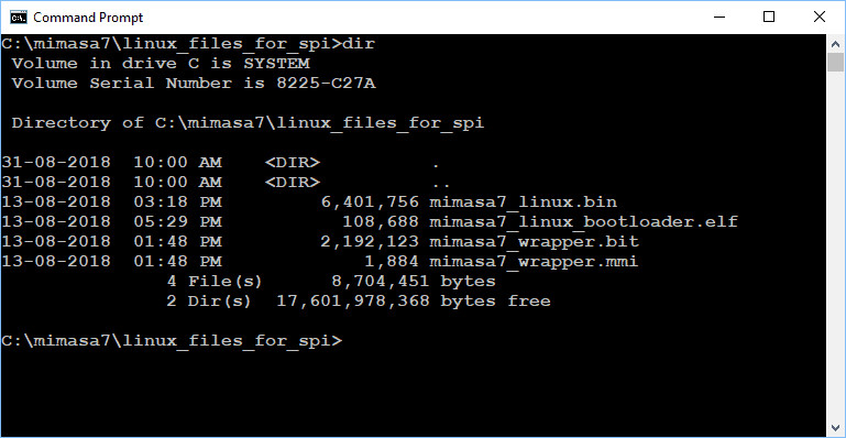 Open the command prompt and ‘cd’ to the directory where the binary files and executable file (in author case the dirctory is ‘linux_files_for_spi’) are located. Merge the Bootloader executable image with bit file by running the following commands: