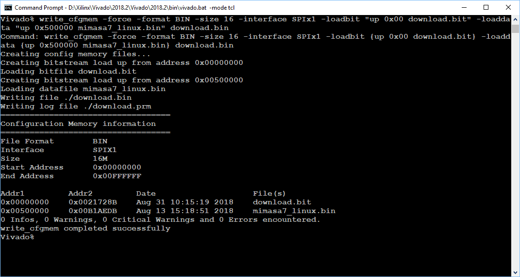 write_cfgmem -force -format BIN -size 16 -interface SPIx1 -loadbit "up 0x00 download.bit" -loaddata "up 0x500000 mimasa7_linux.bin" download.bin