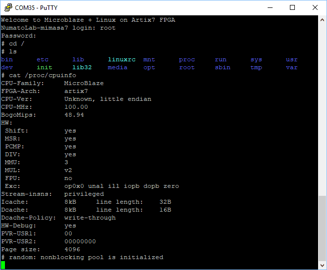 You can login to Linux as “root” with password as “mimasa7”. Image below shows root directory structure, cpuinfo and “uname -a” outputs: