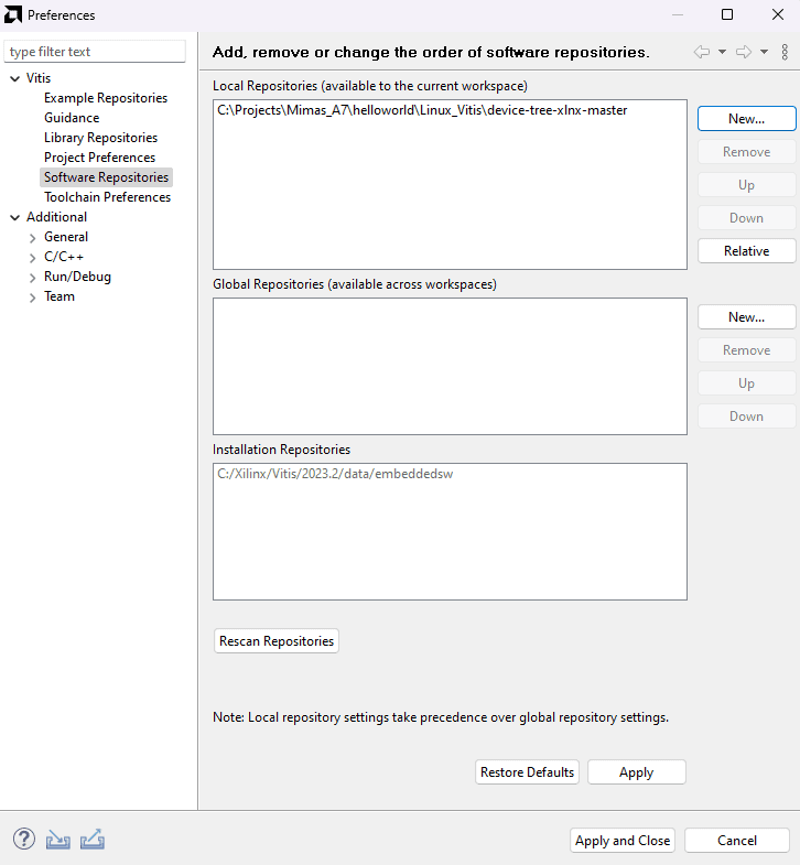Step 3: In the dialog window, select “New” and select the device tree folder which you had downloaded and extracted to Vitis workspace in the “Local Repositories” section. Click “Apply and Close”.