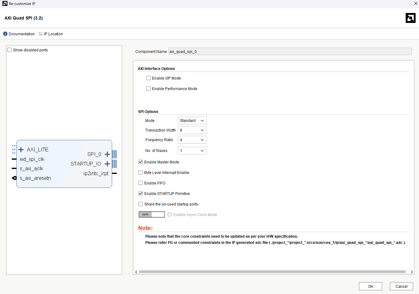 We have already created a block diagram for previous article, we need to add SPI in the block diagram to be able to use flash tool, for that open the block diagram in vivado, click on “add IP” and add “AXI Quad SPI”. Double click on AXI Quad SPI block and change its settings as shown in the figure. Make sure to check the “Enable STARTUP Primitive” option.
