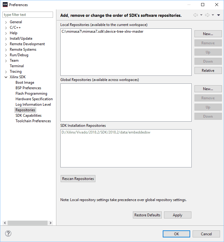 Step 3: In the dialog window, select “New” and select the device tree folder which you had downloaded and extracted to Vitis workspace in the “Local Repositories” section. Click “Apply and Close”.