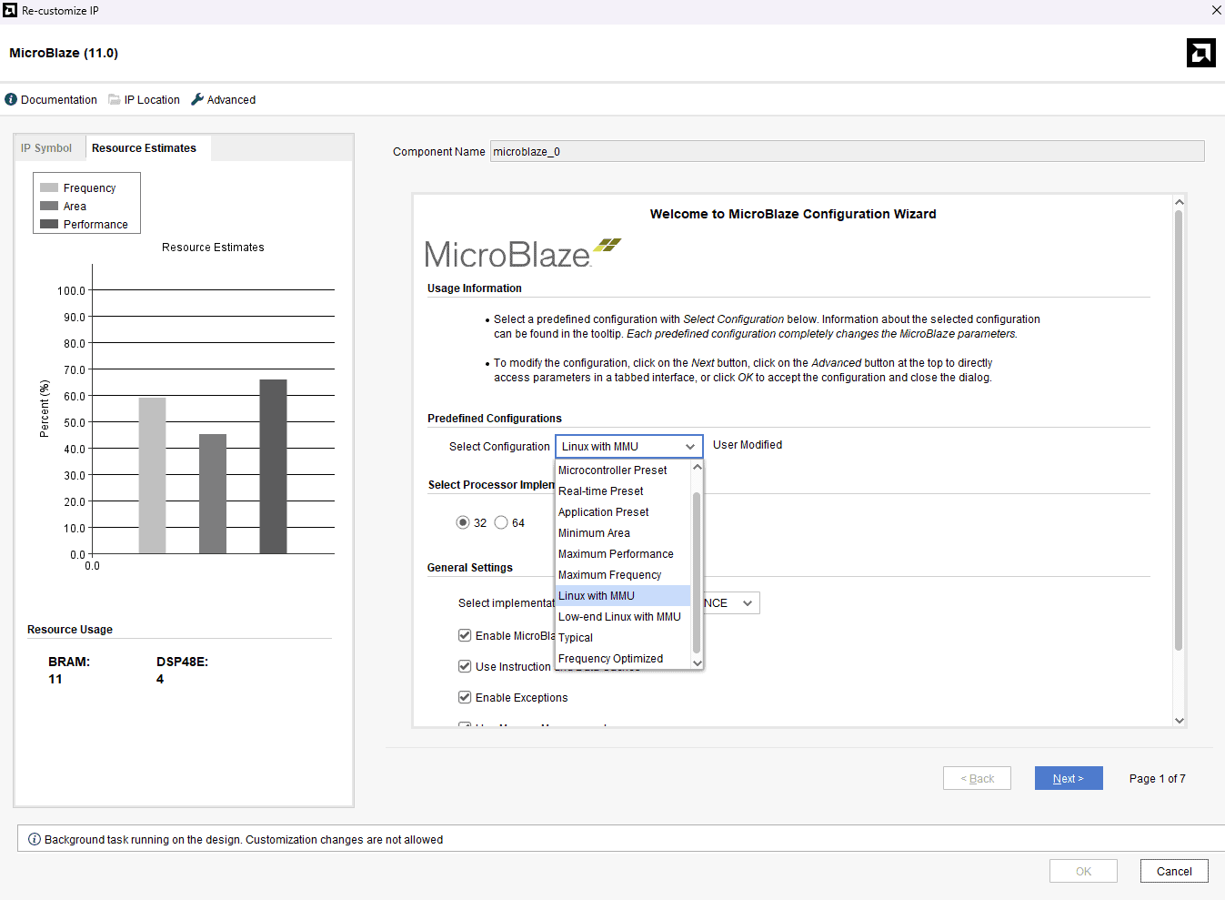 To run our Linux system, we will be modifying the above created Microblaze based design. We need to modify this Microblaze IP block to be able to run Linux on Mimas A7 board. Open the above created block design, double click on the Microblaze block and choose the Select Configuration as “Linux with MMU” as shown in the image below.