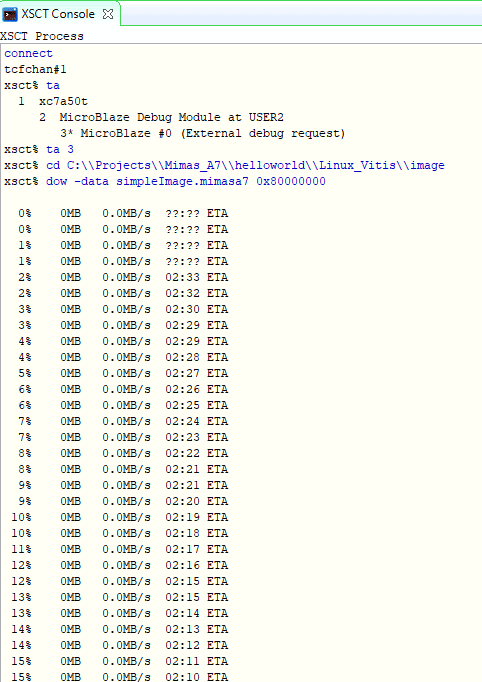 Step 2: First run Hello World program again to check everything is connected properly and to ensure that it works. Now, go to Vitis -> XSCT Console, type in a command “targets” it will show all the targets connected, note down the number where MicroBlaze 0 is connected (3 in this article), connect to MicroBlaze by giving the command: