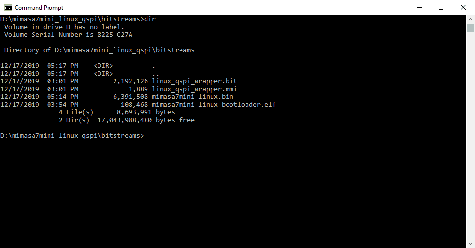Open the command prompt and ‘cd’ to the directory where the binary files and executable file (in author case the directory is “D:\mimasa7mini_linux_spi\bitstream”) are located. Merge the Bootloader executable image with a bit file by running the following commands: