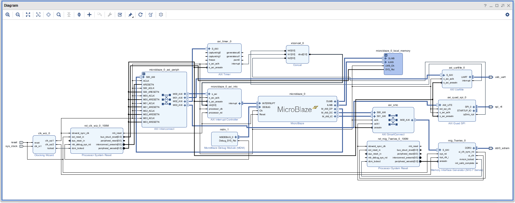 Click “Run Block Automation” present in the “Designer Assistance available” bar on the top left corner of the window to complete the design. Click “OK” for Vivado to automatically configure the blocks for us. Once the Block Automation is complete, click “Run Connection Automation” so Vivado can connect the blocks to make a complete system. Select the “Validate Design” option from the Tools menu to make sure that the connections are correct and save the design. The final design will look similar to the image below.
