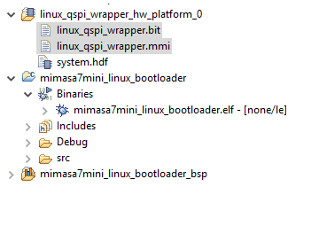 - The bootloader executable (This file can be found in the directory mimasa7mini_linux_bootloader\Debug under the Vitis bootloader project folder and has .elf extension).