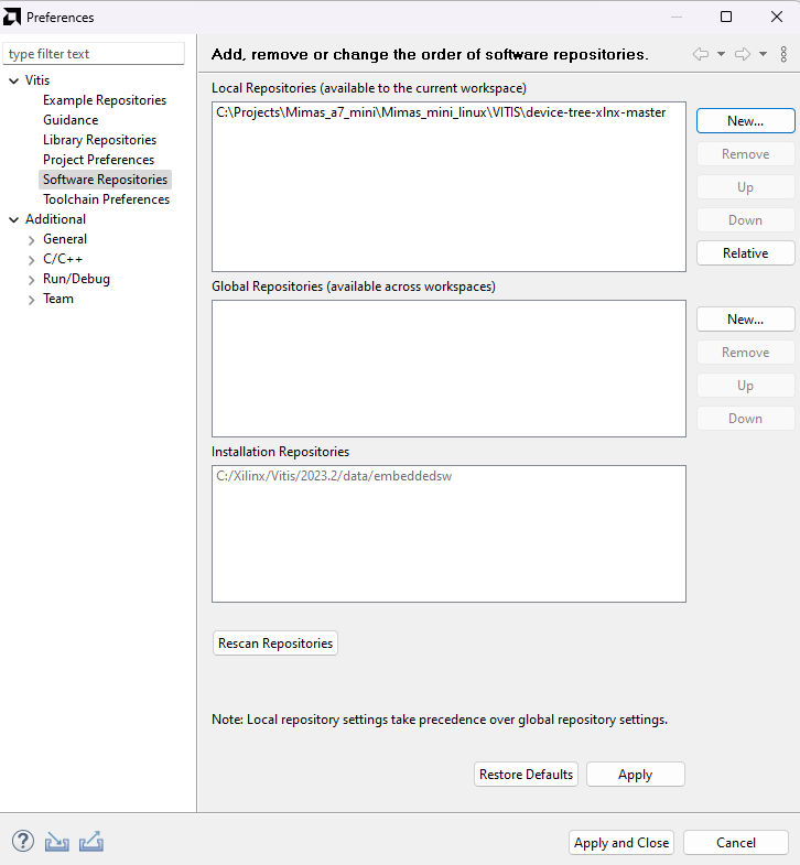 In vitis, select “Vitis->Software Repositories” from the menu. In the dialog window, select “New” and select the device tree folder which we have downloaded and extracted to Vitis workspace in the “Local Repositories” section. Click “OK”.