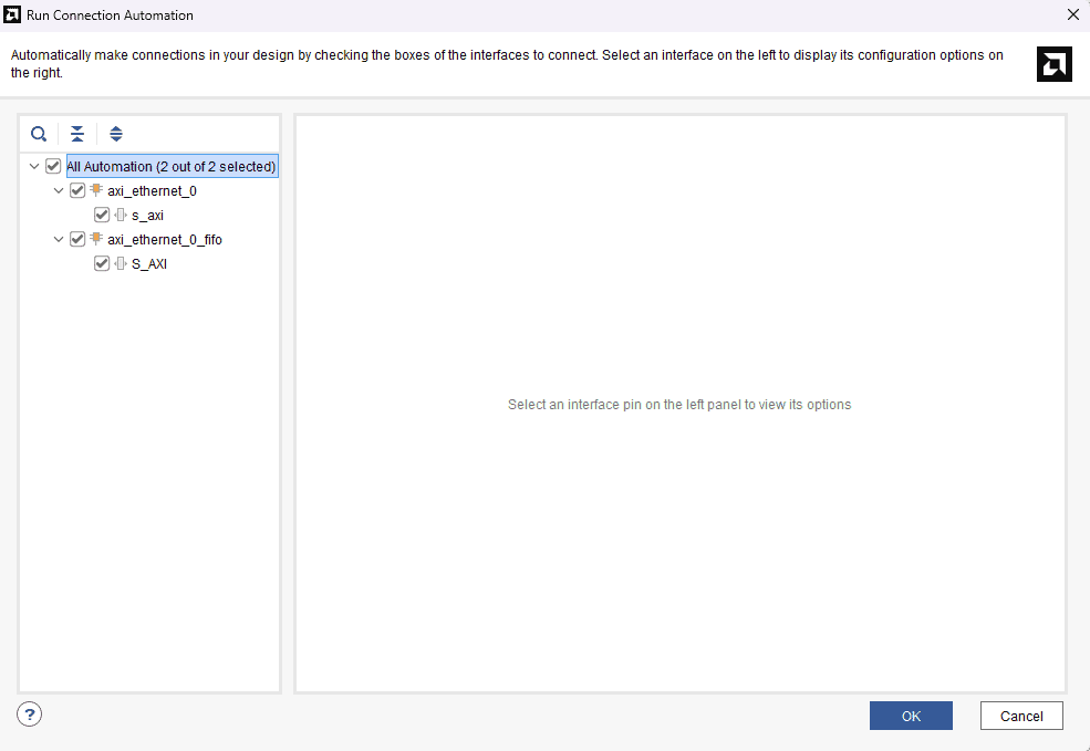 Run Block Automation for AXI Ethernet and select “DMA” for the AXI Streaming interface.