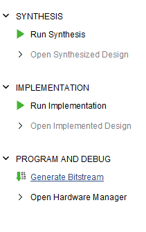 Click Generate Bitstream under the PROGRAM AND DEBUG section of Vivado to synthesize, implement and generate the bitstream.
