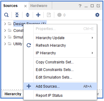 Right-Click on ‘Design Sources’ and select ‘Add Sources’. It will open a configuration window for adding Verilog files.