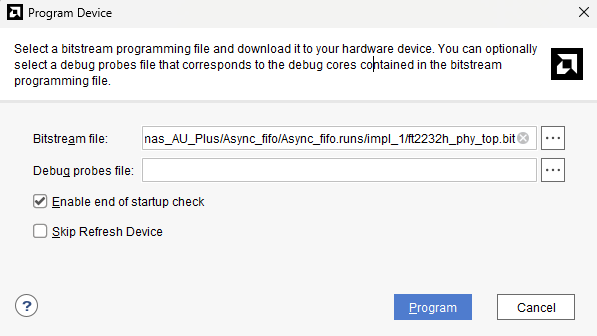 Dialog window for programming will open. Program the bit file by clicking ‘Program’.