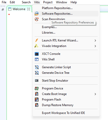 Step 2: In Vitis , go to “Vitis” and click “Software Repositories”.
