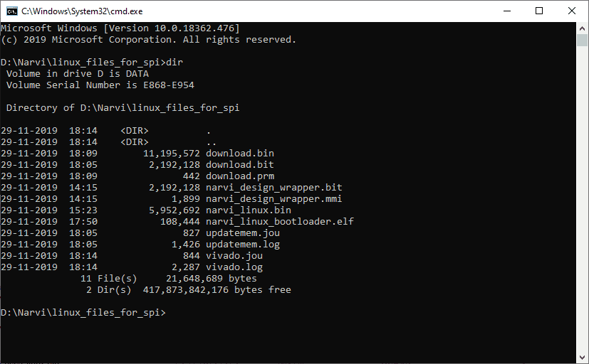 If this command succeeded, you will see a few new files in the directory and one of them would be “download.bin”. This is the final binary image that we need to download to Narvi’s SPI flash. The following image shows all files in my directory after executing all the above-mentioned steps.