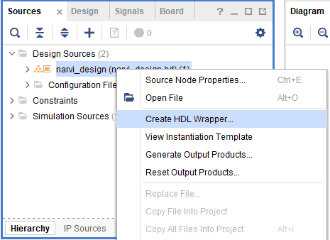Step 2: Right-click on the block design in the “Sources” window, select “Create HDL Wrapper” from the popup menu. Click “OK” on the window that appears to finish generating the wrapper.
