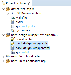 - The bit file(.bit) for the Microblaze system and the Memory Map file .mmi) (Both files can be found in your SDK’s Project Explorer under the project named “narvi_design_wrapper_hw_platform_0” or similar. Please see the image below).