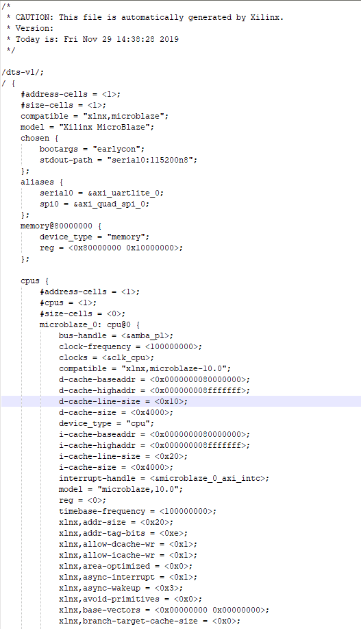 Step 5: We have to merge the ‘.dtsi’ and ‘.dts’ files. Merge these two files using a text editor (like Notepad++ etc) and copy the contents of system-top.dts and paste them in the .dtsi file just after the line ‘model = “Xilinx MicroBlaze”’. Don’t forget to add “/dts-v1/;” at the top of .dtsi file also. The final content should look like this: