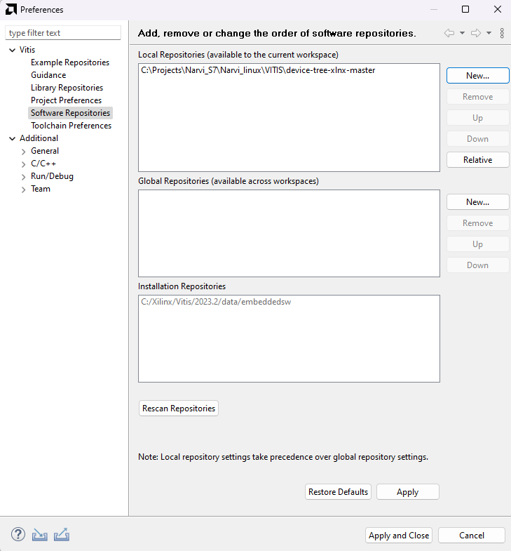Step 3: In the dialog window, select “New” and select the device tree folder which you had downloaded and extracted to Vitis workspace in the “Local Repositories” section. Click “OK”.