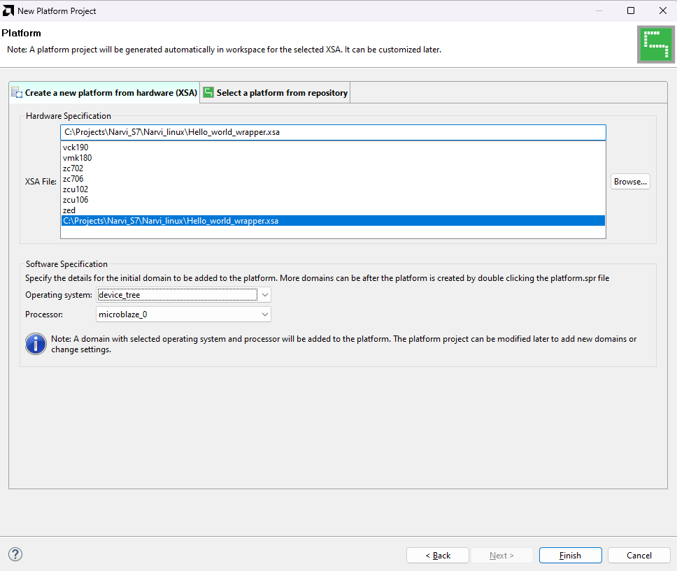 Step 4: Click on “Create Platform Project“. In the “Create a new platform from hardware (XSA)” browse and select your XSA file. Select the “Operating system” as “device_tree” and click on “Finish“. This should generate a system.dts file along with a .dtsi file. We need both of them.