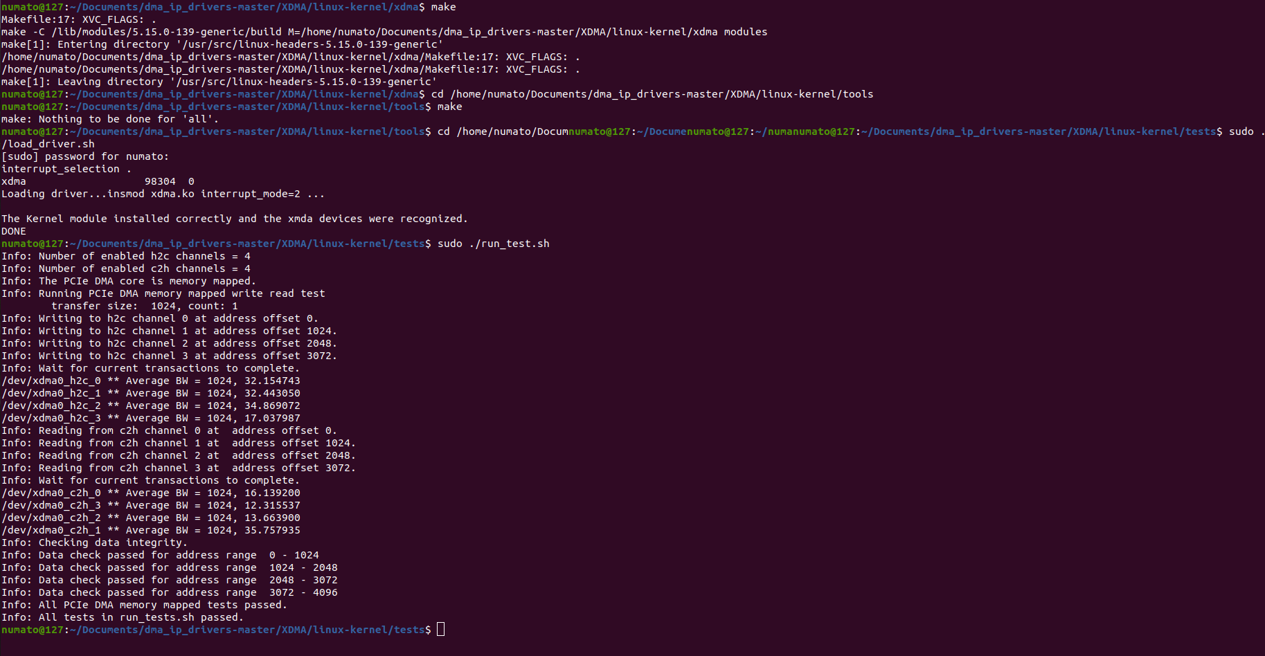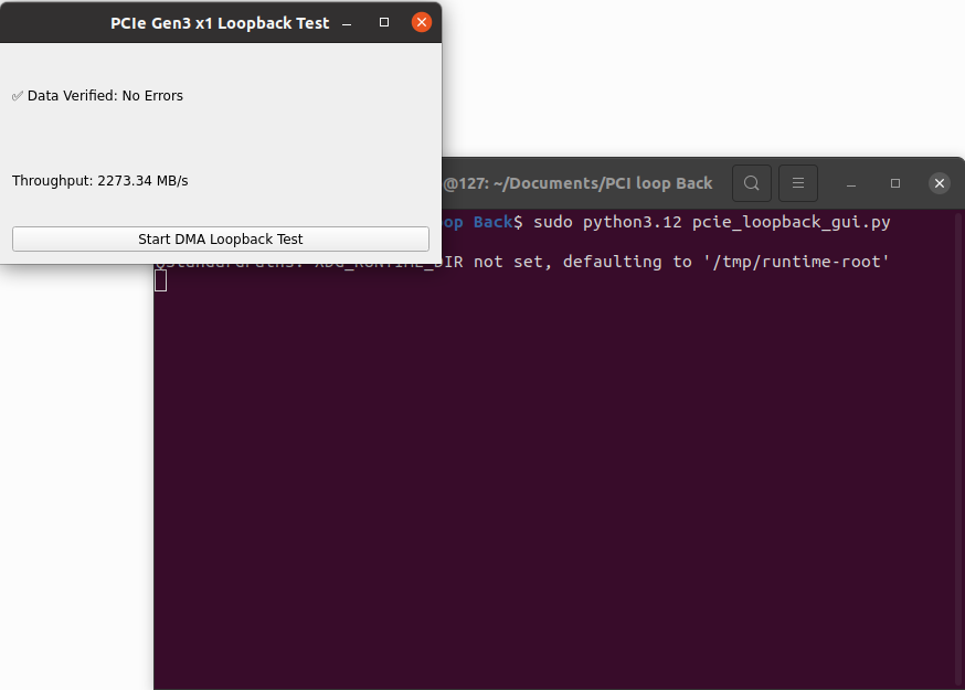 To perform the PCIe DMA loopback test, simply download the provided script and run “sudo python3 pcie_loopback_gui.py” command in the terminal. The tool writes 1 MB of data from the host to the FPGA (H2C), reads the same amount back from the FPGA (C2H), checks if the data matches, and displays the measured throughput.
