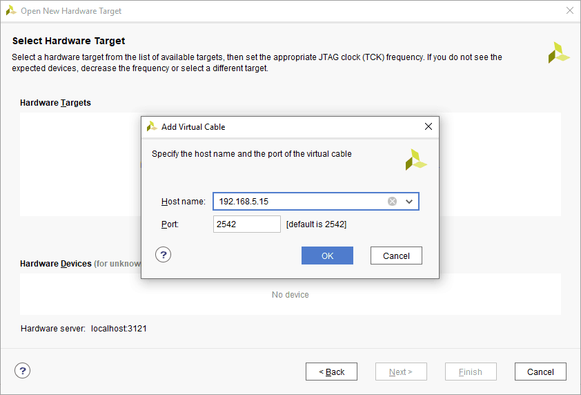 In the next wizard click “Add Xilinx Virtual Cable (XVC)” and enter the Host Address of the system/machine in which target is connected, leave the Port Number as 2542 and click “OK”.