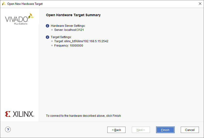 Click “Next” and we can observe the “Hardware Target Summary” wizard.