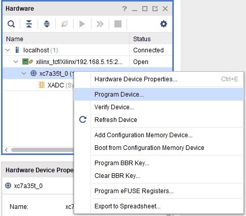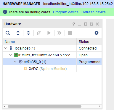 If the target is added successfully, we can observe “xc7a35t_0” available as a Hardware Device in the JTAG Chain.