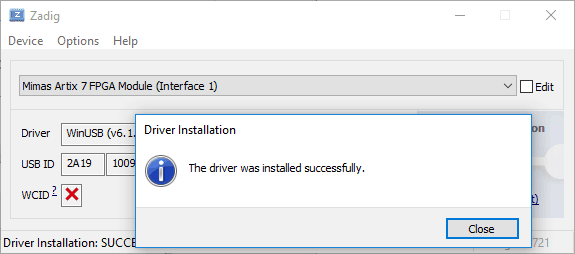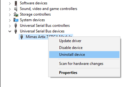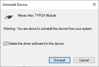 Open Device Manager-> Universal Serial Bus Devices, select Mimas Artix 7 FPGA Module, right-click and select “Uninstall device”. In the “Uninstall Device” dialog window, select “Delete the driver software for this device.” and click “Uninstall”.