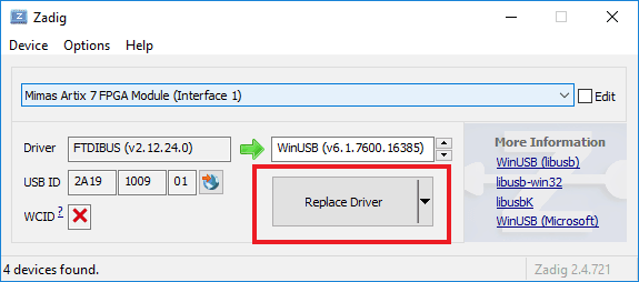 Select “WinUSB” drivers in the target driver to replace the “FTDIBUS” drivers. Click “Replace Driver” to install WinUSB drivers as follows.