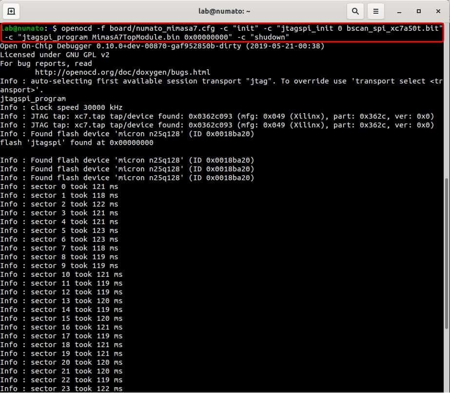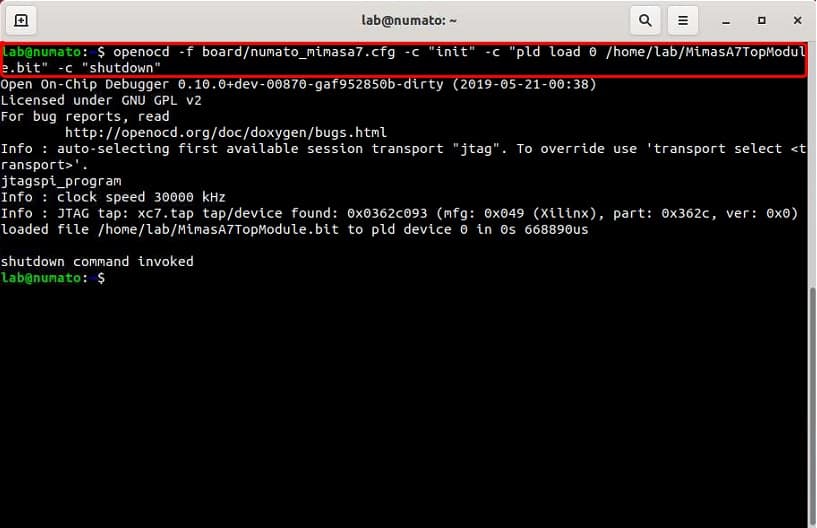 Download Mimas A7 configuration file numato_mimasa7.cfg from here and save the file to “/usr/share/openocd/scripts/board/” directory.
