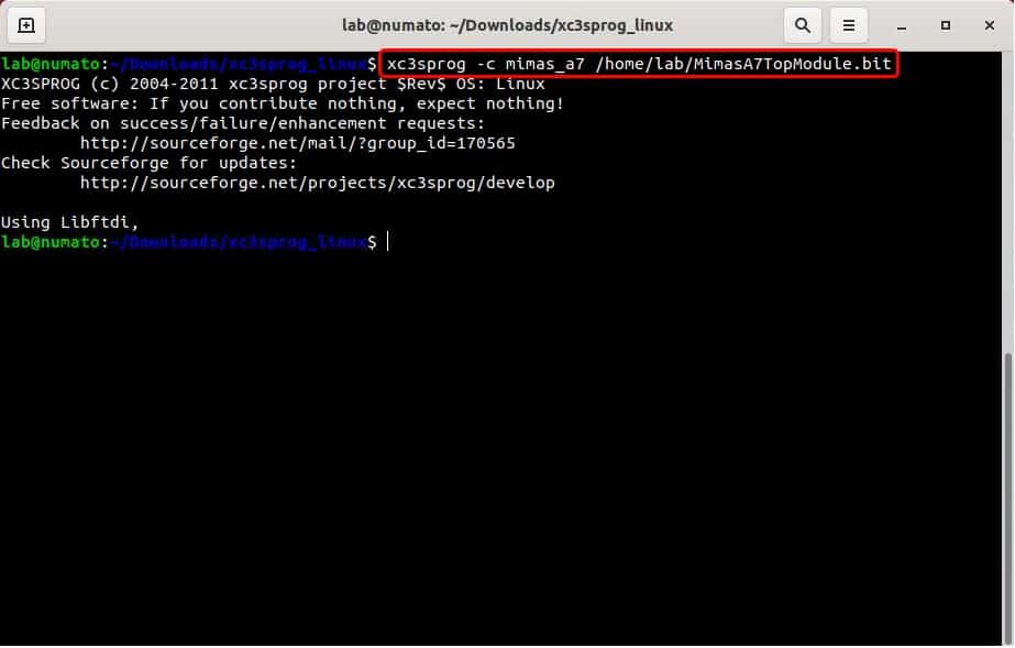 And that’s it, the Mimas A7 board should now be programmed with the bitstream using XC3SProg, without the need for any external JTAG hardware.