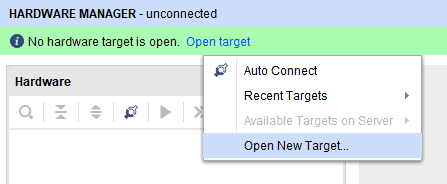 To program through the XVC server using Vivado as a client, open Vivado -> Hardware Manager -> Click on “Open target” and select “Open New Target”. You will get the “Open New Hardware Target” wizard, click “Next” to proceed.