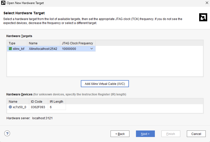 Under the Hardware Server Settings, connect to the Local server or Remote server. You need to select the “Local server” option if the Vivado Hardware server is running in the local machine (most common usage) otherwise, select Remote server and click “Next”.