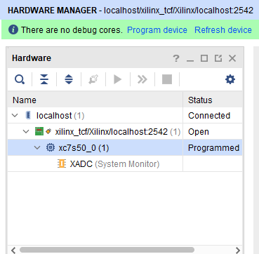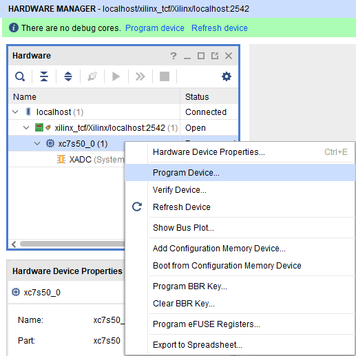 Right-click on the “xc7s50_0” device and select “Program Device”.