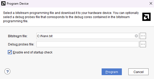 Find the Narvi bitstream file that you wish to program to the board and click “Program”.